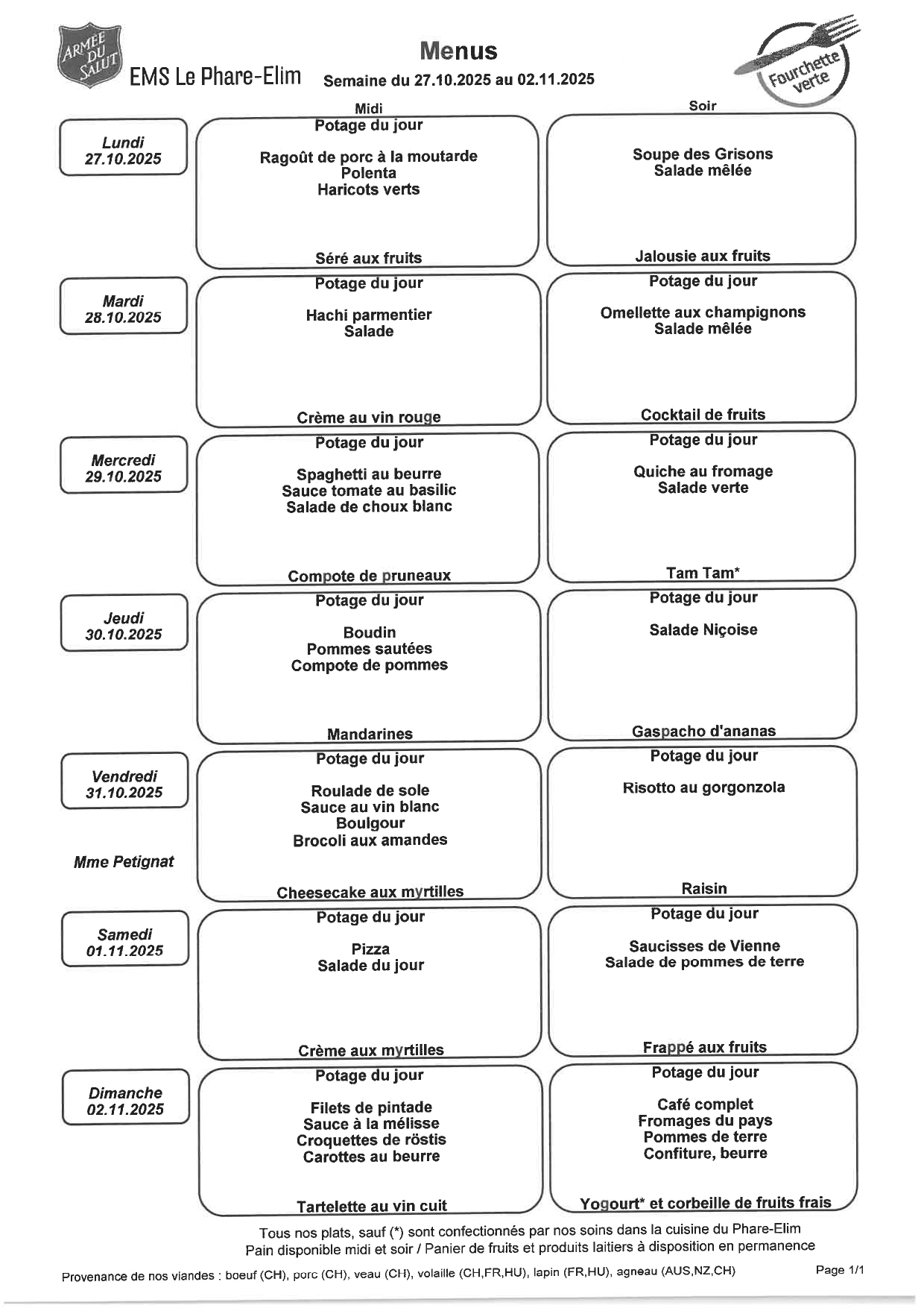 - Un repas équilibré, cuisiné sur place et labellisé « fourchette verte ».